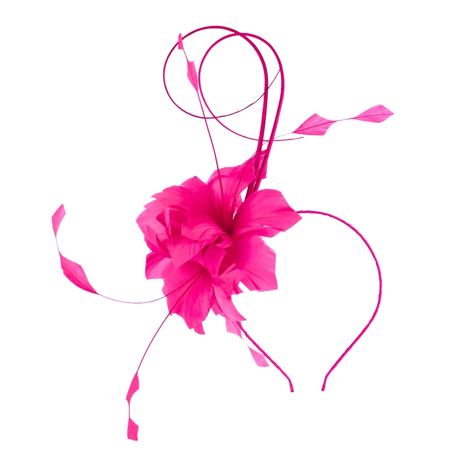 Floral feather headband fascinator with quills. Pack A: Black, Ivory, Navy, Pale Pink. Pack B: Chocolate, Fuchsia, Red, Royal Blue. Pack C: Fuchsia, Green, Pale Blue, Silver.