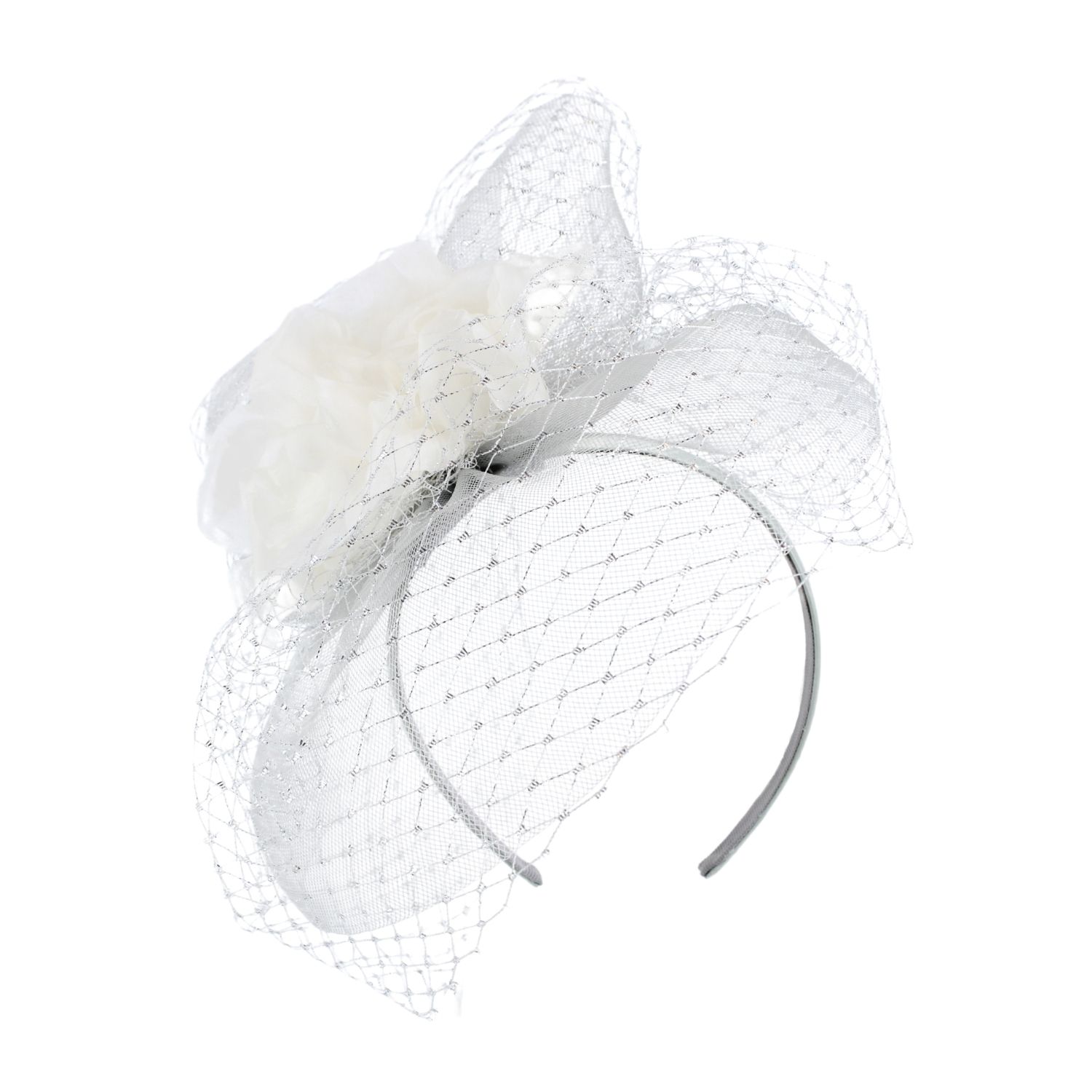 Floral headband fascinator with lurex sparkle veil. Pack A: Black, Ivory, Navy, Pale Pink. Pack B: Chocolate, Fuchsia, Red, Royal Blue.