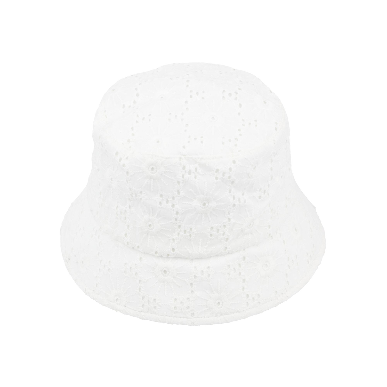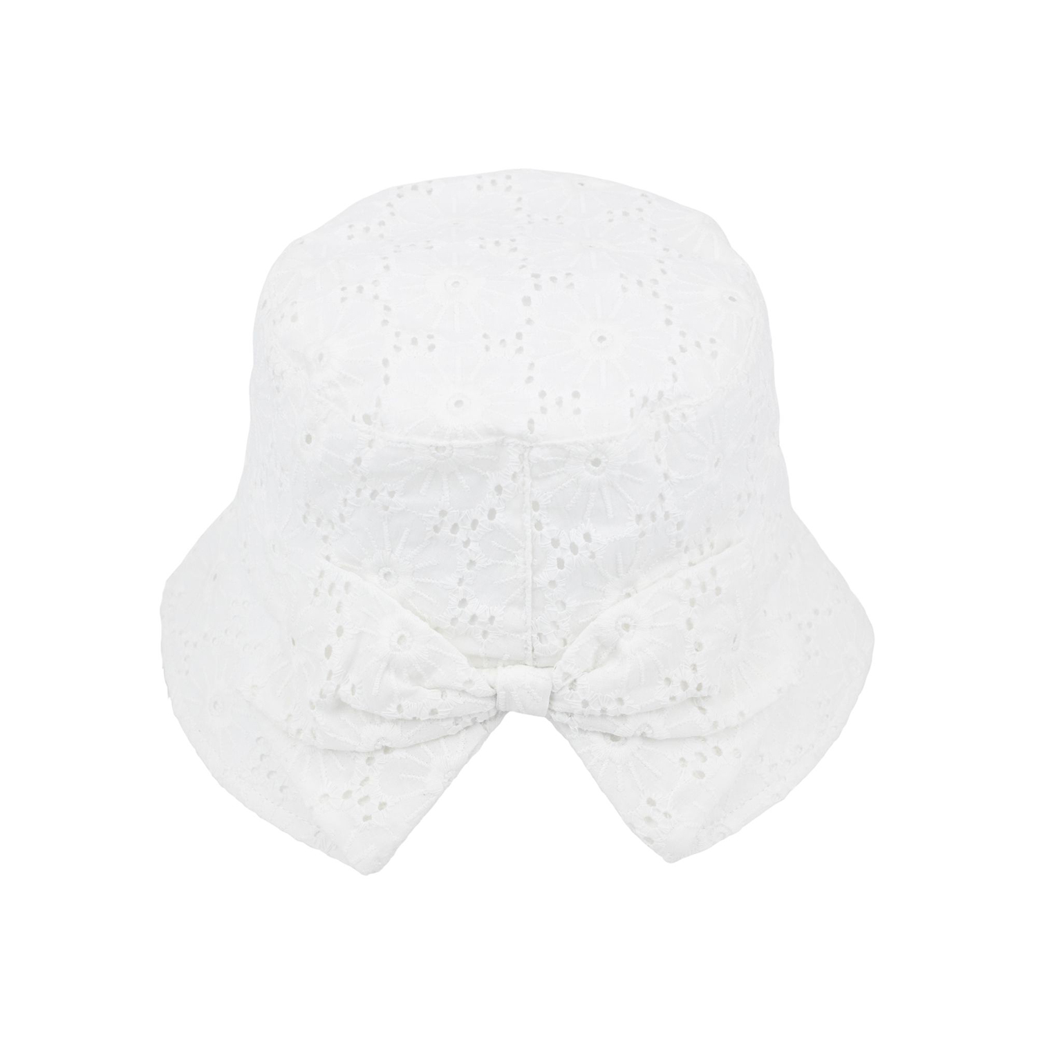 Ladies broderie bucket hat with bow cut out detail. Pre-order only. Delivery available from March 2026.