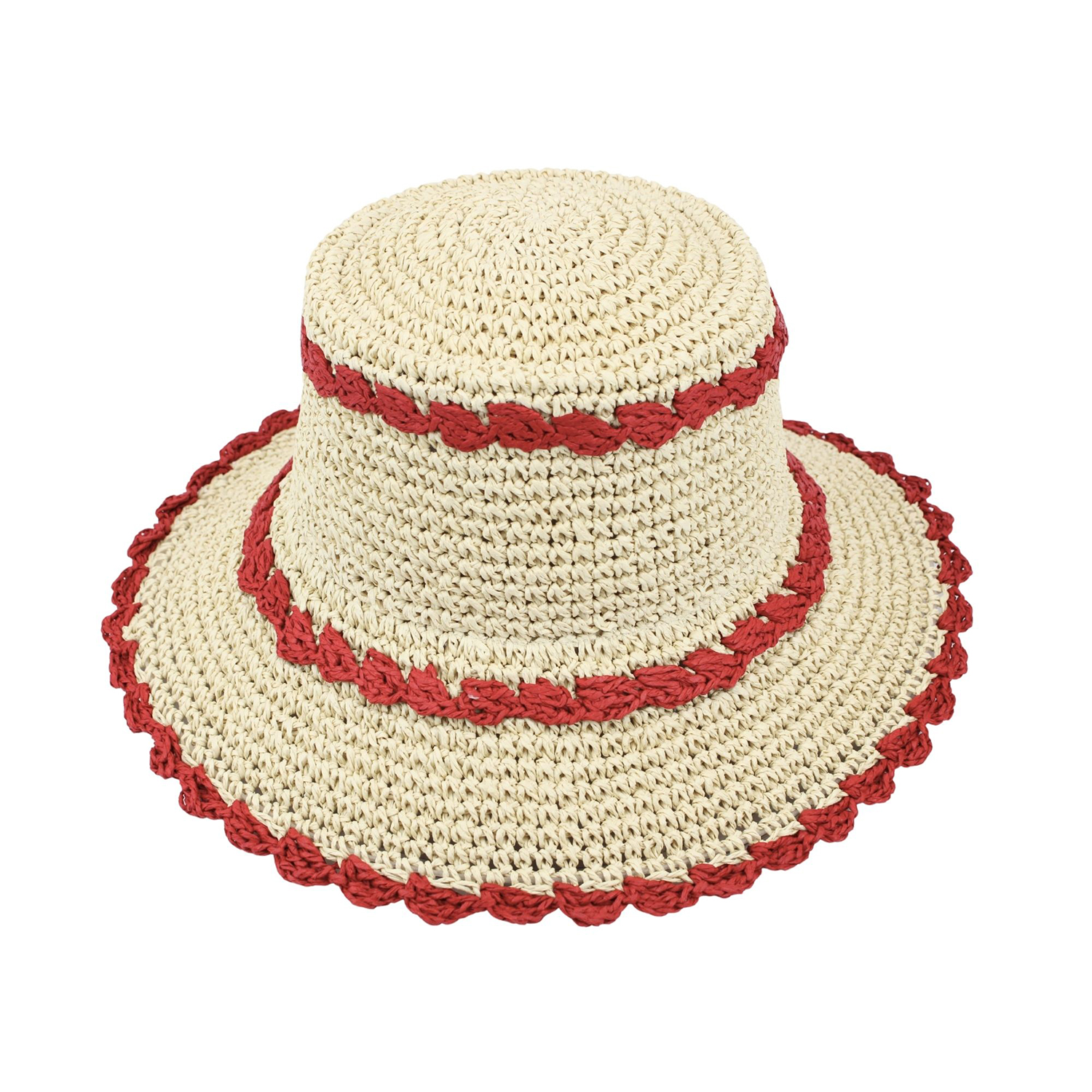 Ladies contrast scalloped trim crochet FSC paper straw bucket hat. Pre-order only. Delivery available from March 2026.