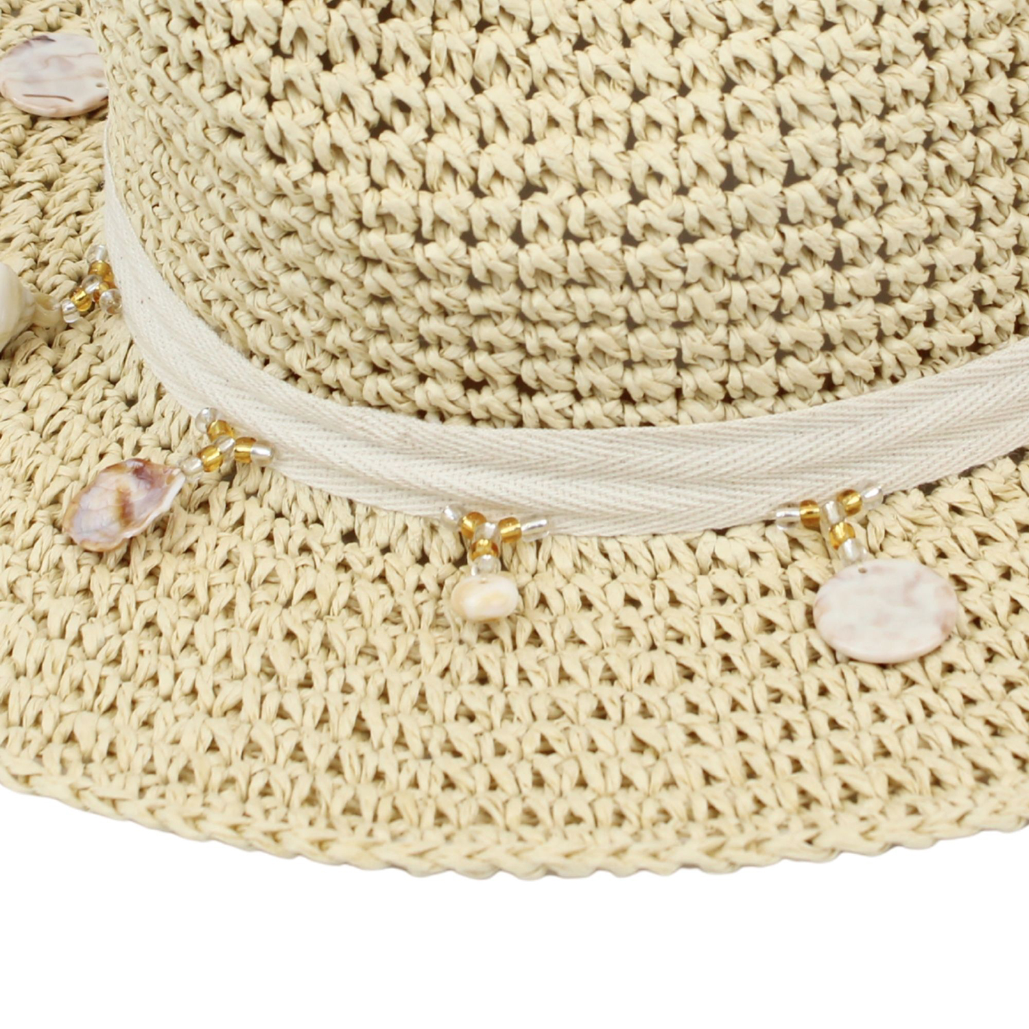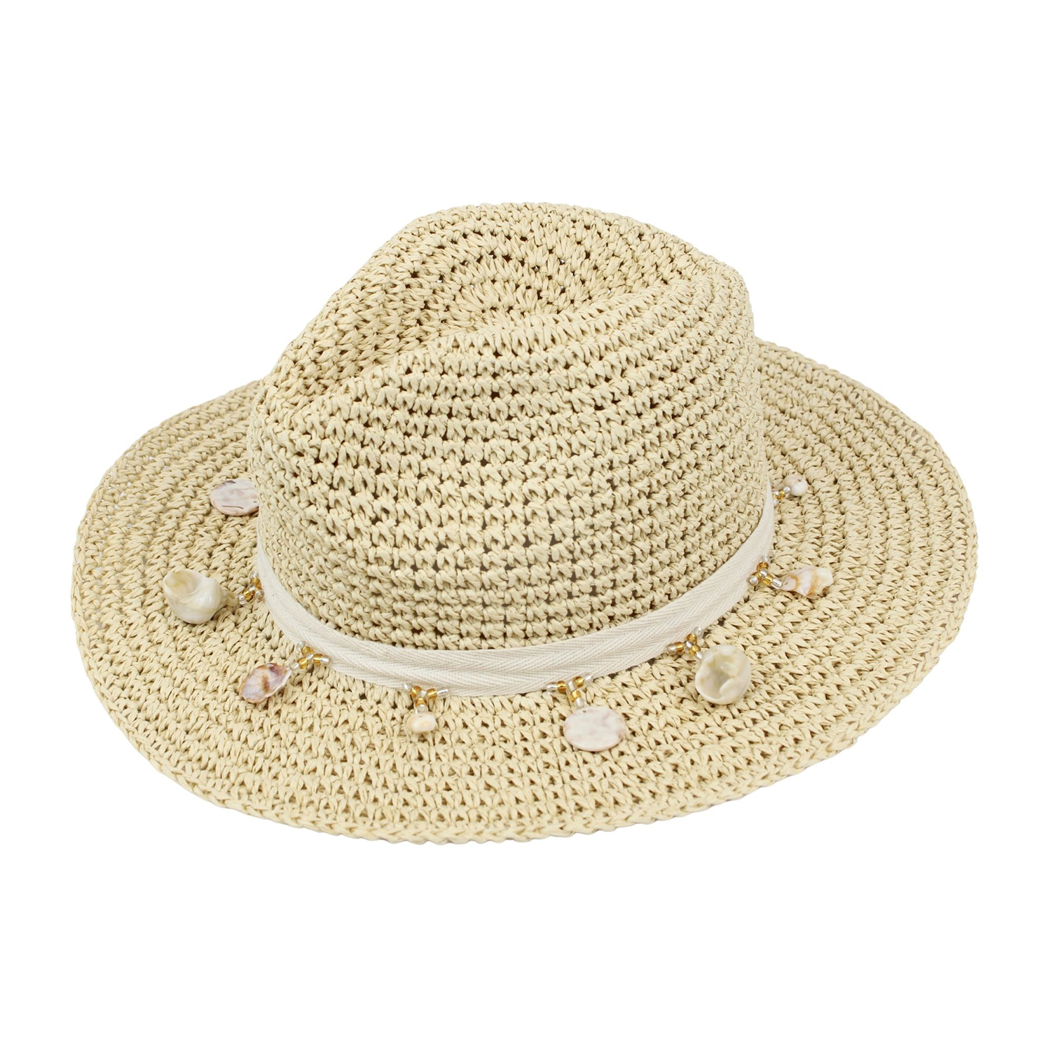 Ladies FSC paper straw fedora hat with faux shell and bead trim. Pre-order only. Delivery available from March 2026.