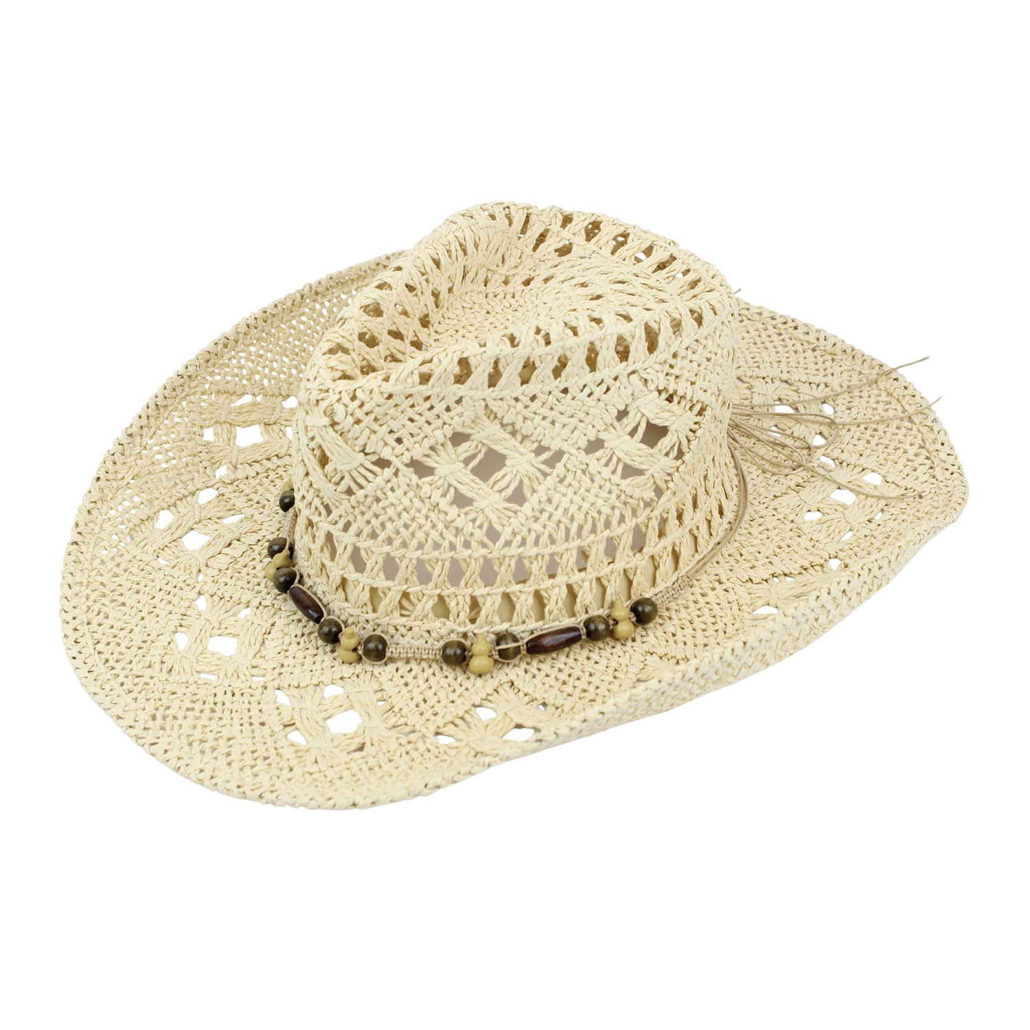 Ladies crochet FSC paper straw cowboy hat with bead trim. Pre-order only. Delivery available from March 2026.