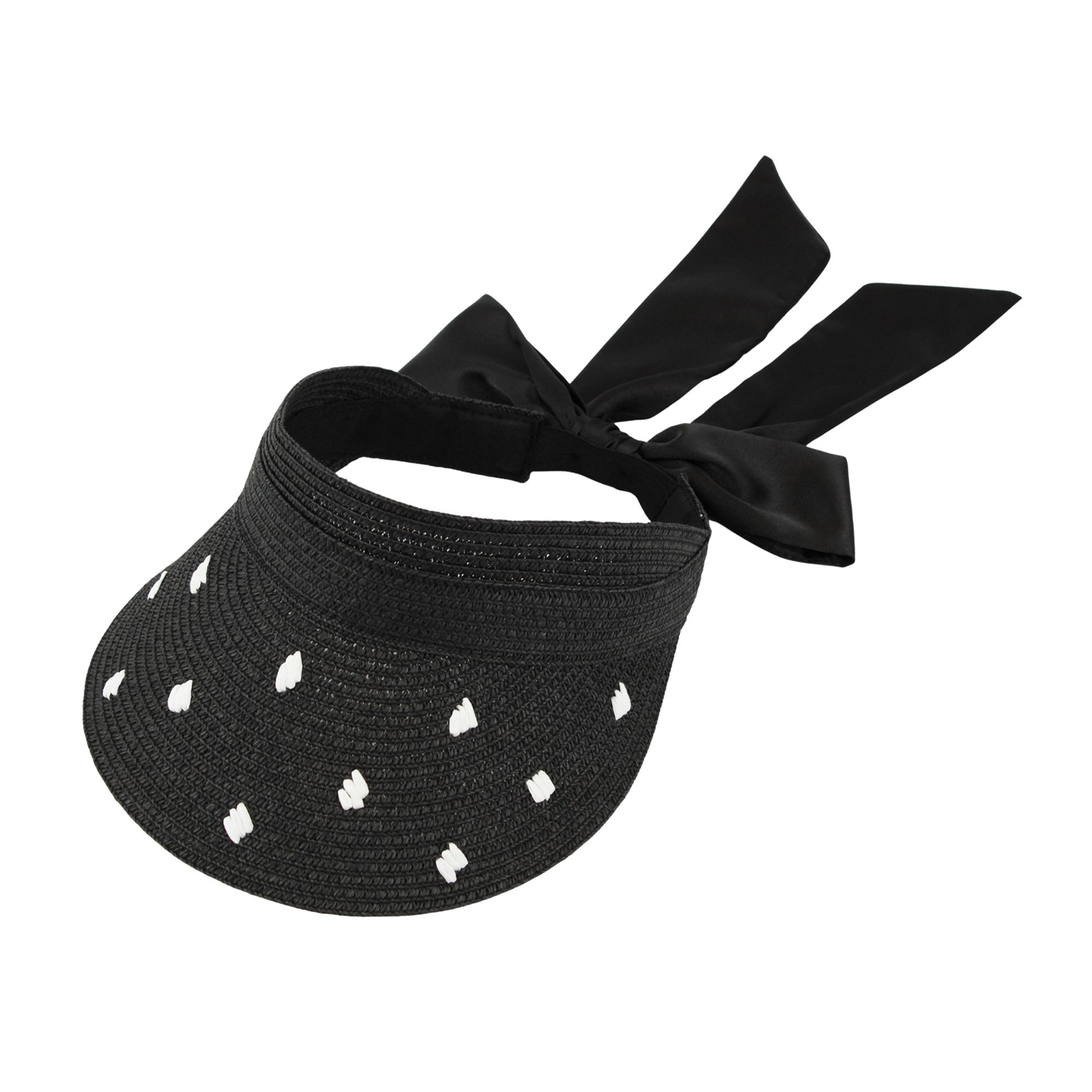 Ladies embroidered polka dot FSC paper straw visor with satin ribbon ties. Pre-order only. Delivery available from March 2026.