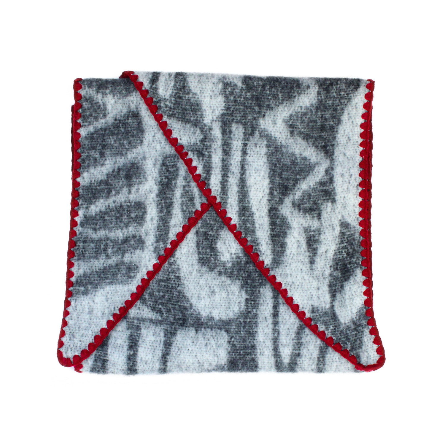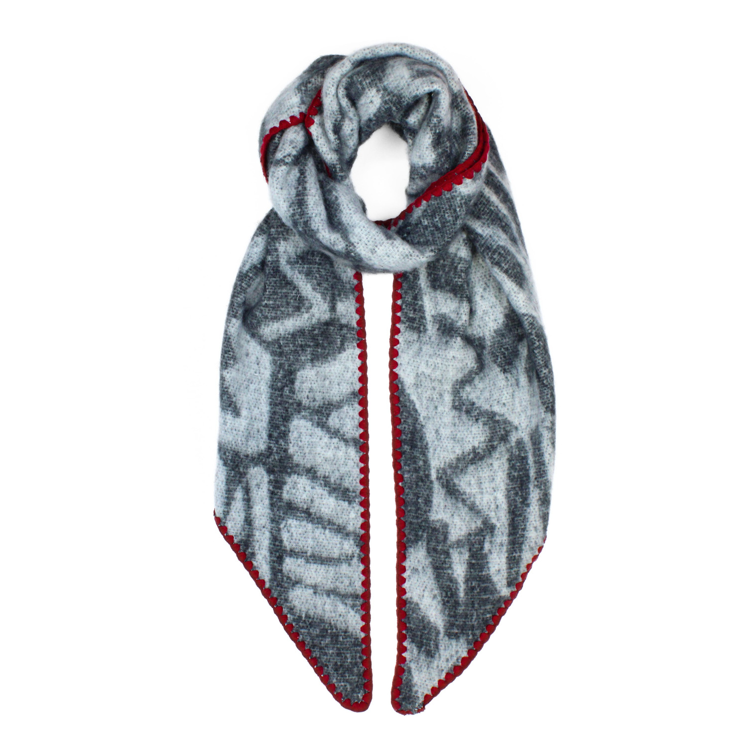 Ladies asymmetric abstract print scarf with contrast stitch hem detail