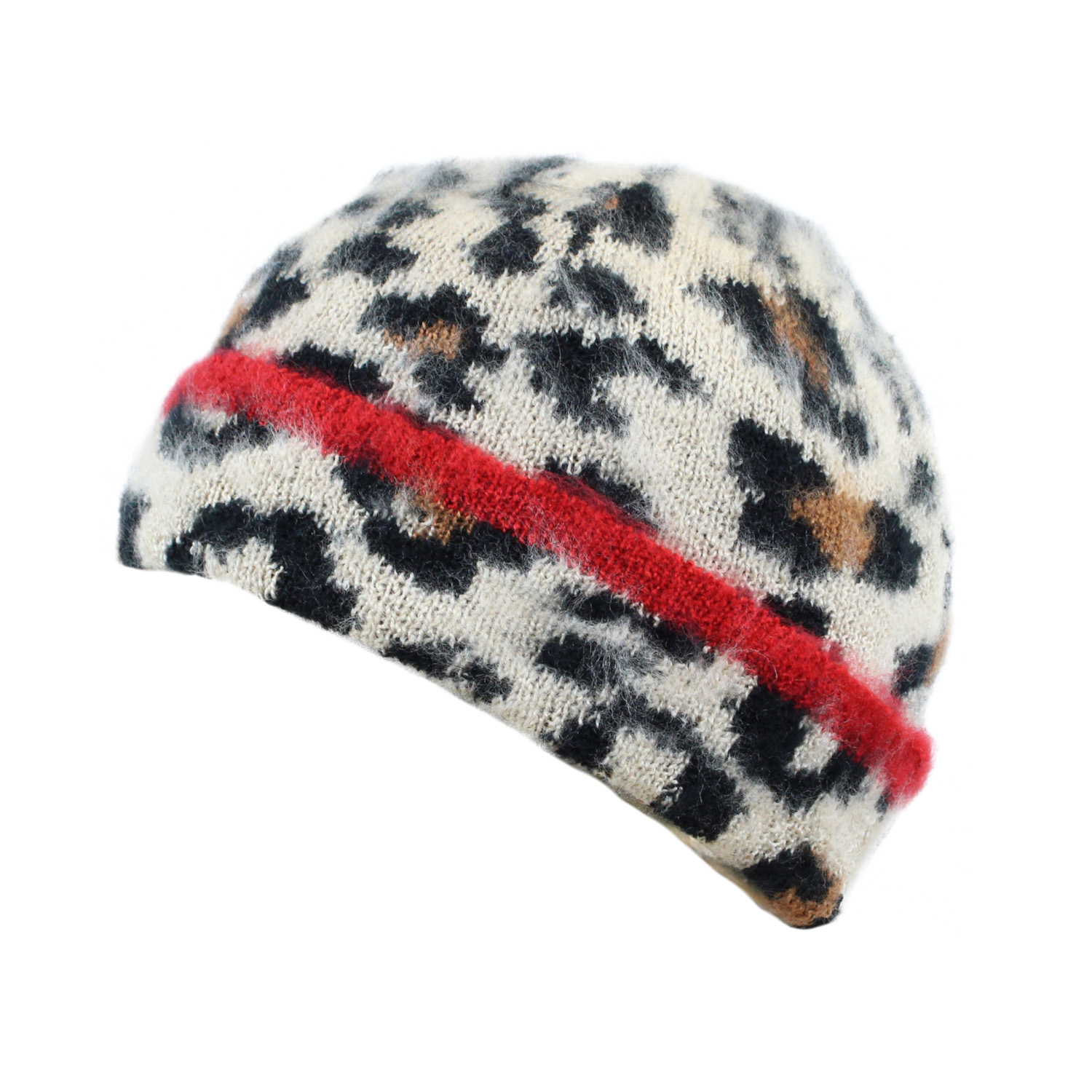 Ladies brushed animal print beanie with contrast colour hem line