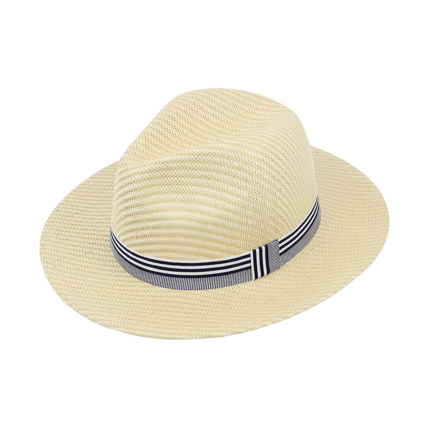 Mens FSC paper straw fedora hat with stripe fabric band. Pre-order only. Delivery available from March 2026.
